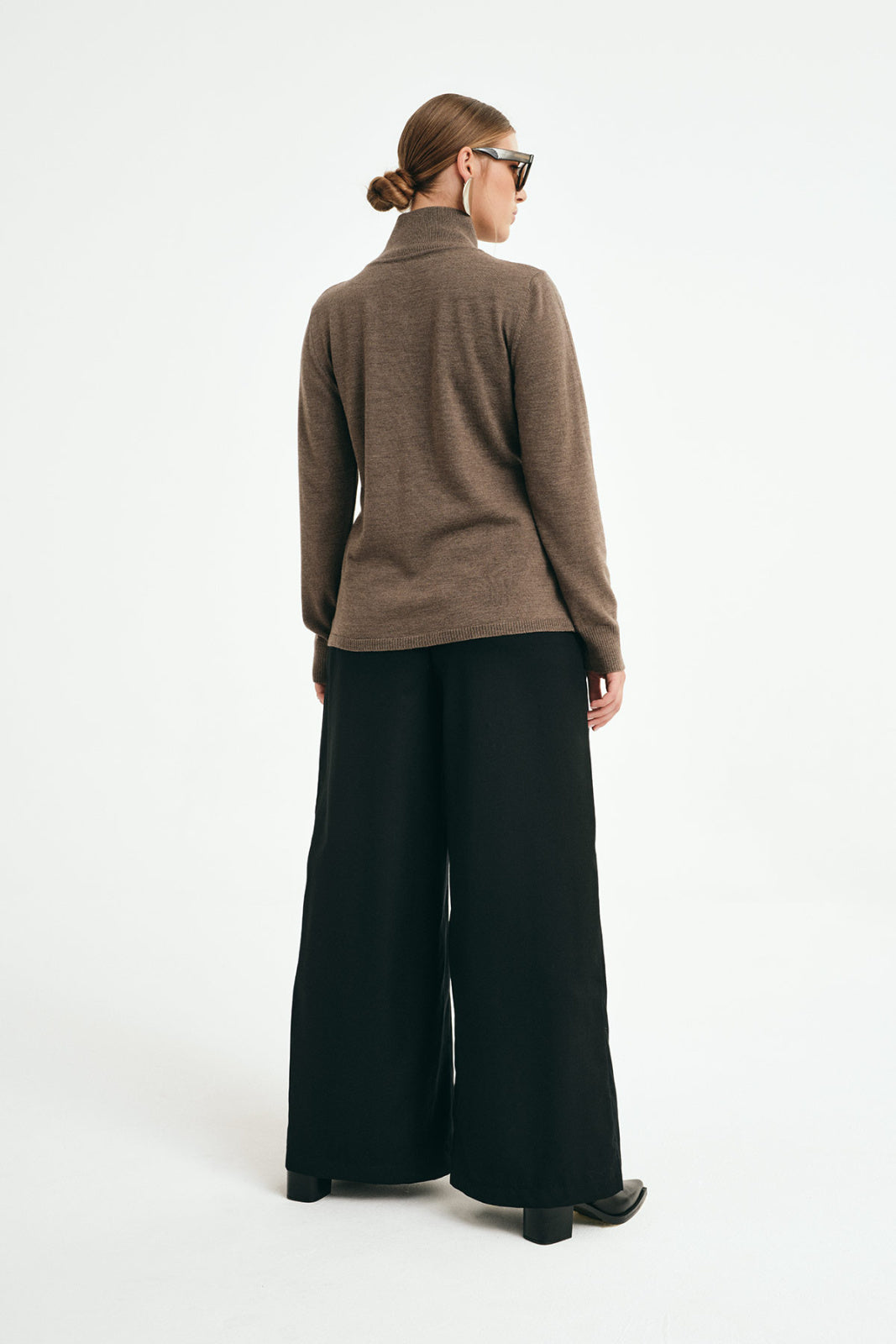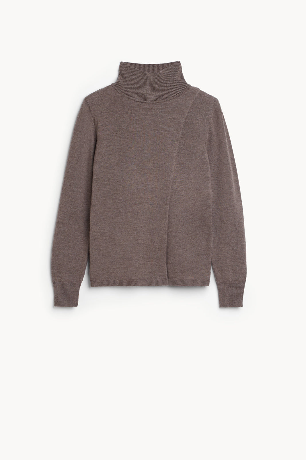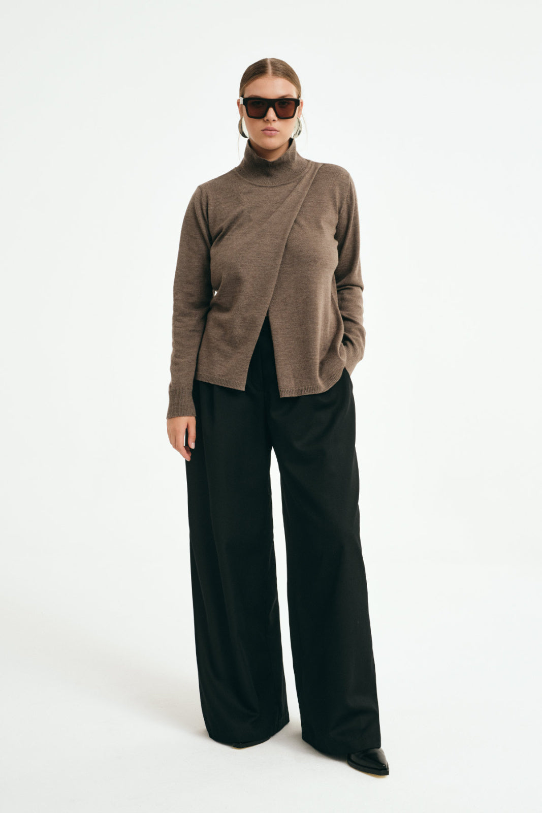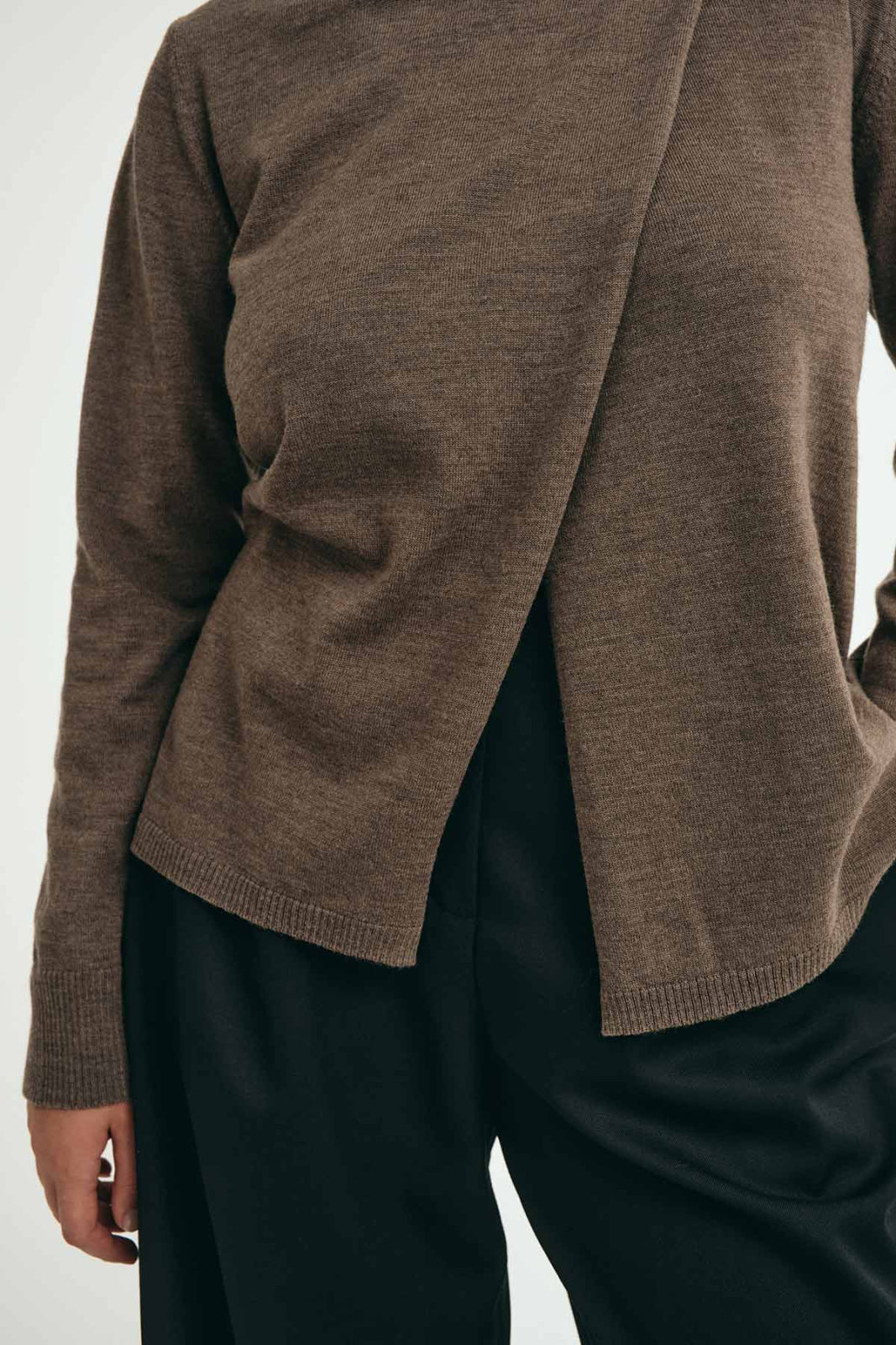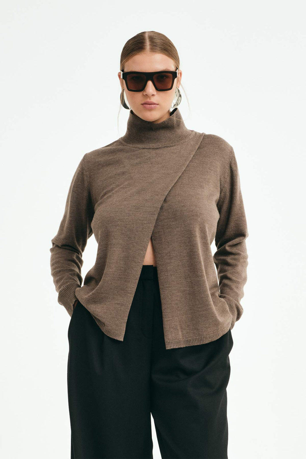 Svetr s rolákem vyrobený ze 100% merino vlny. Má originální vrstvenou přední část, která mu dodává osobitý charakter a umožňuje různé stylizace. Nome je reinterpretací klasického roláku v tlumených barvách, který je základem podzimního kapslového šatníku. Svetr je vyroben z nejkvalitnější merino superjemné příze od německého výrobce. Vyznačuje se dlouhým vlasem, díky němuž příze neplstnatí a nevytahuje se. Výrobek se vyrábí v polské pletárně.