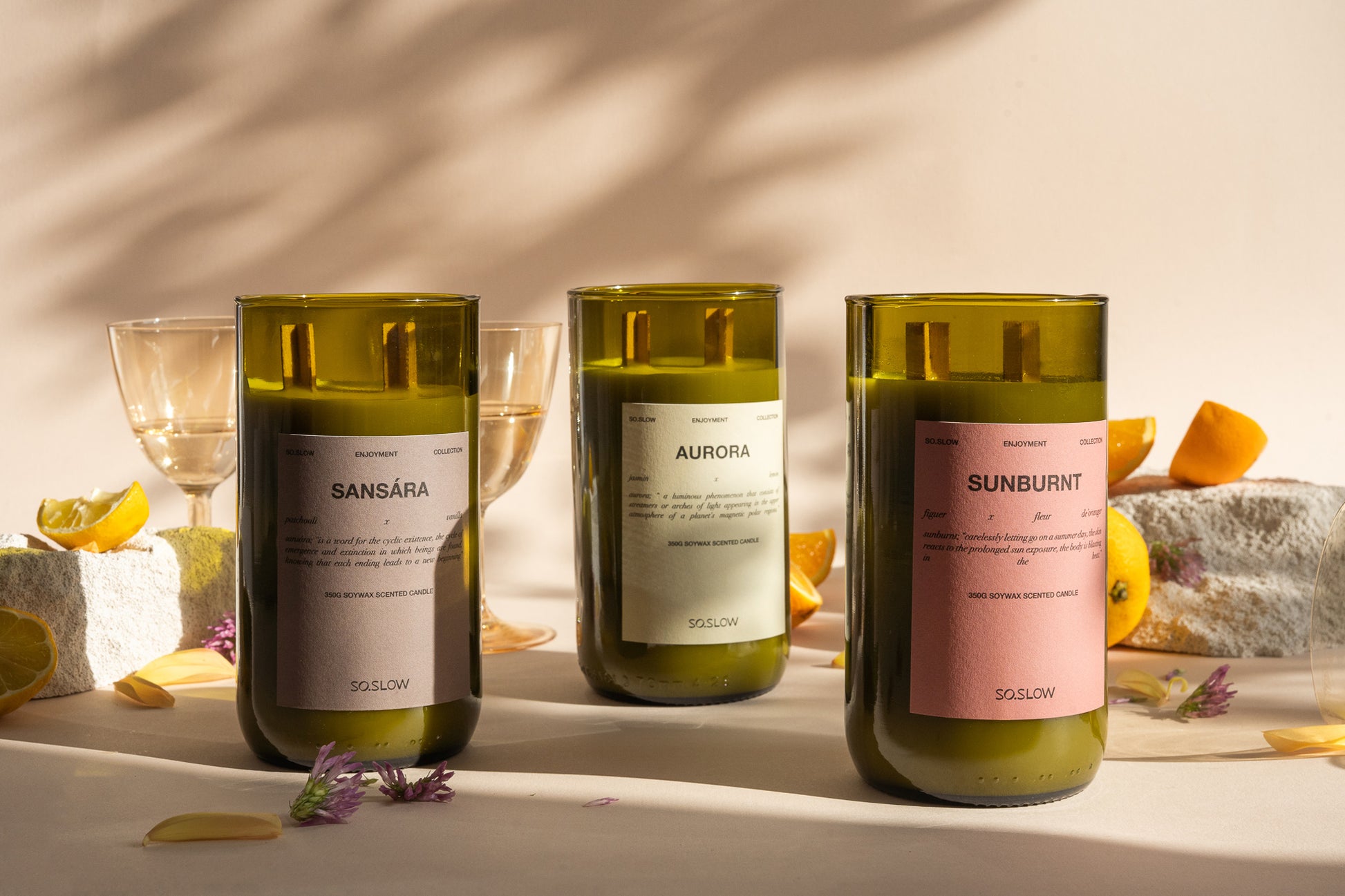 Additional Information: 350 g soy wax, wooden wick, glass from a used wine bottle