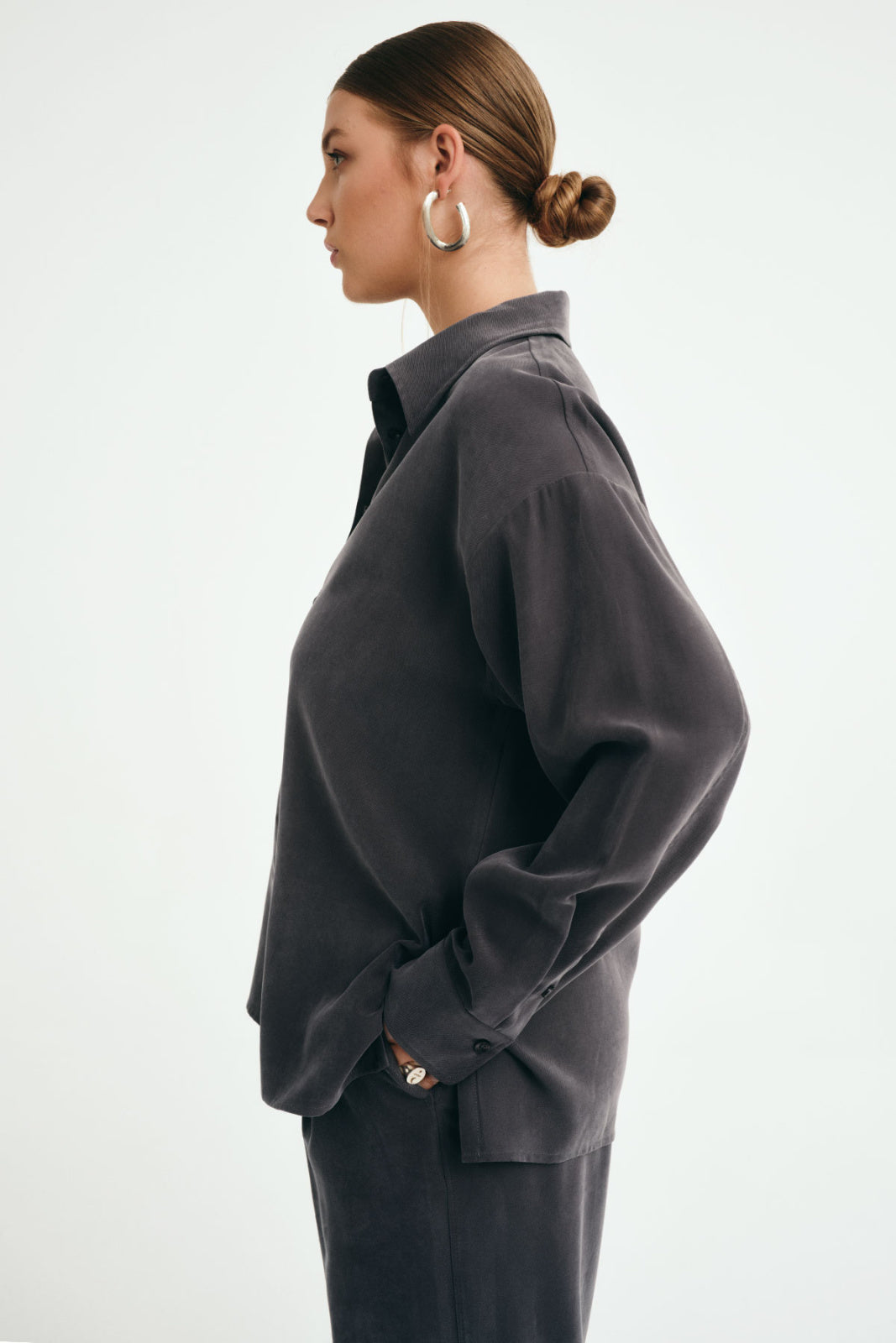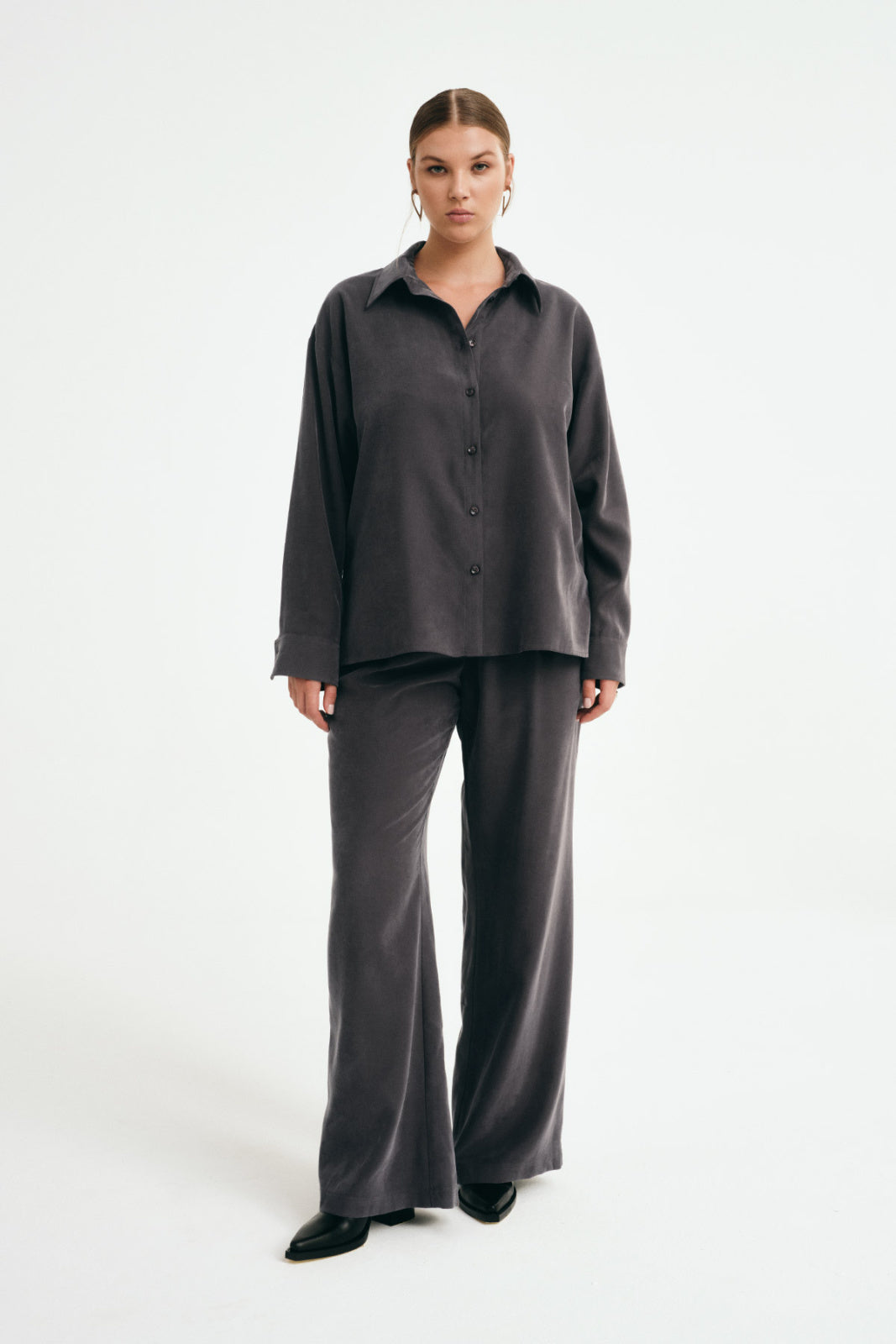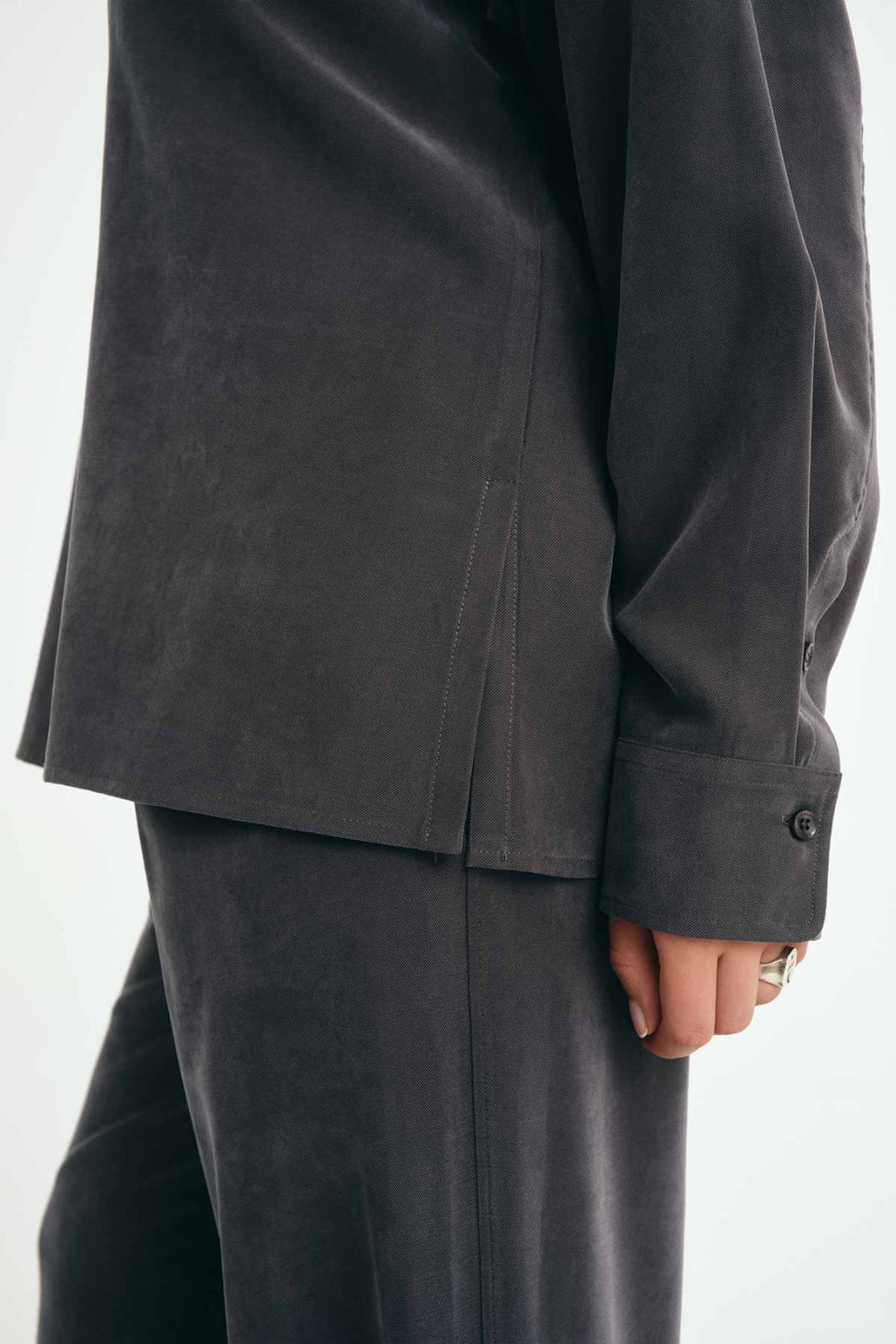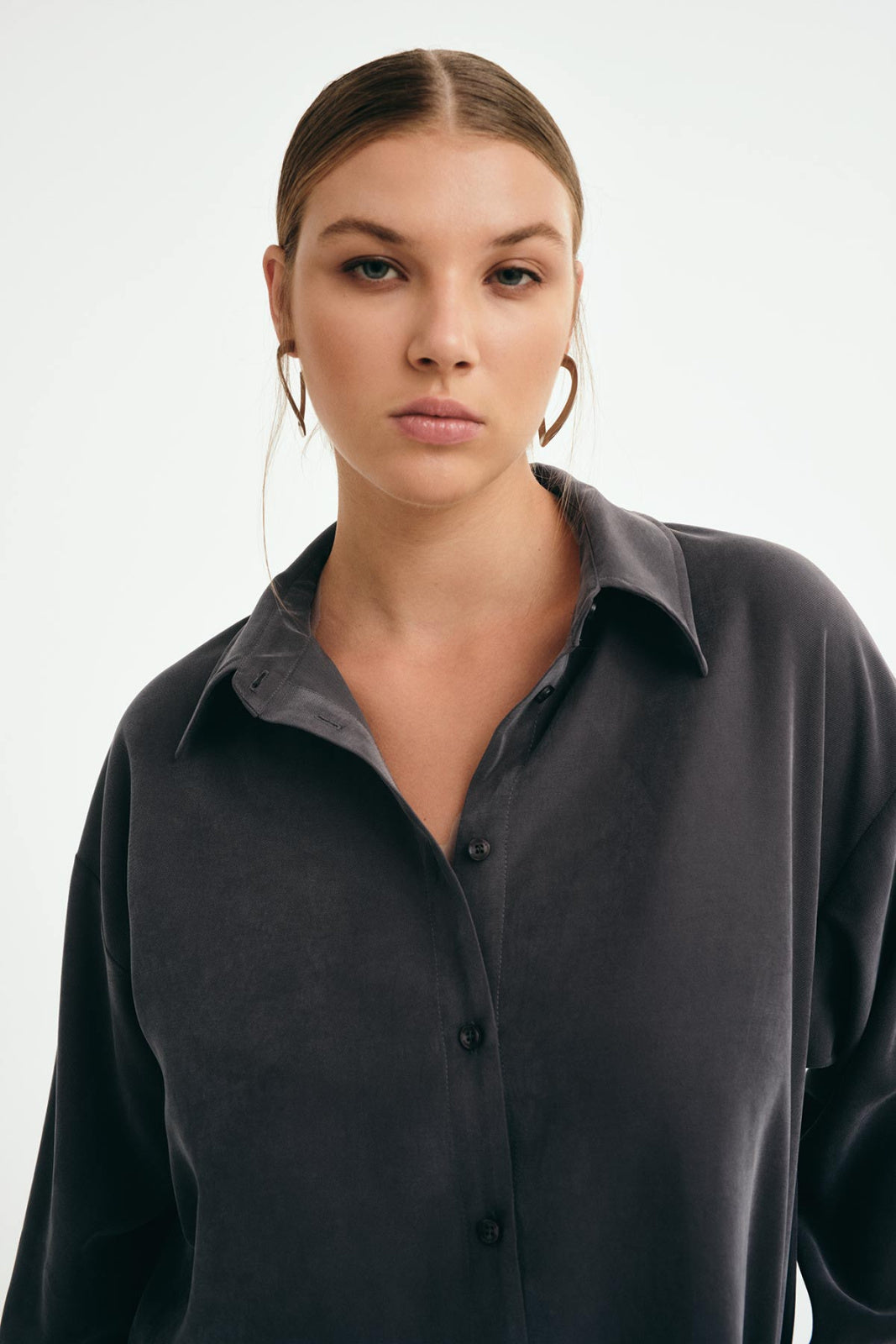Košile s jednoduchým krabicovým střihem ze splývavé tkaniny se zakončením "Peach" tang. Látka je měkká a velmi příjemná na dotek. Košile se zapíná na knoflíčky ve stejné barvě a má spadlý rukáv zakončený manžetou, kterou lze ohrnout. Na bocích má rozparky. Košile se dá sladit s kalhotami Justin ze stejné látky a vytvořit tak stylový komplet.